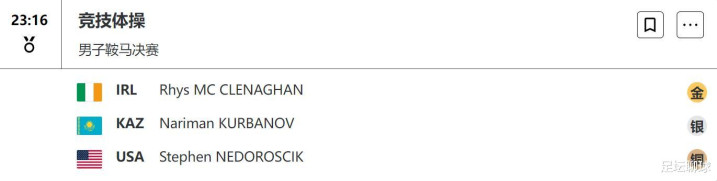 男子鞍马:没有中国选手参赛,麦克莱纳汉拿到15.533分夺冠,这是爱尔兰历史上的首枚奥运体操金牌。