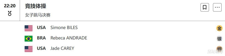 女子跳马:没有中国选手参赛,美国名将拜尔斯以15.300的总分夺得金牌,个人奥运奖牌数已经达到10枚(7金1银2铜),再次刷新了美国体操运动员奥运奖牌数最多的纪录。
